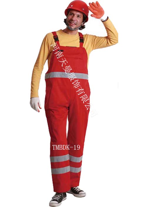 • 產品簡介:背帶褲,反光條背帶褲,產品詳細描述 :   面料:T/C, 16*12,108*56,260-270GSM;5CM反光條環繞衣前,衣后和雙褲腿一周,一個帶蓋胸兜,塑脂拉鏈,兩個斜插兜,背帶松緊帶并有卡扣可以調節背帶長度,腰部可調節松緊。